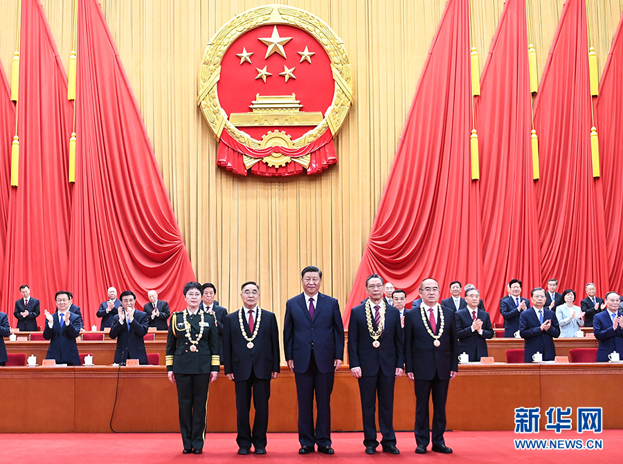 6名号手吹响仪式号角,4名礼兵手捧共和国勋章、国家荣誉称号奖章正步走上主席台,铿锵的步伐在人民大会堂大礼堂内久久回荡。中华人民共和国国家勋章和国家荣誉称号颁授仪式开始了。
