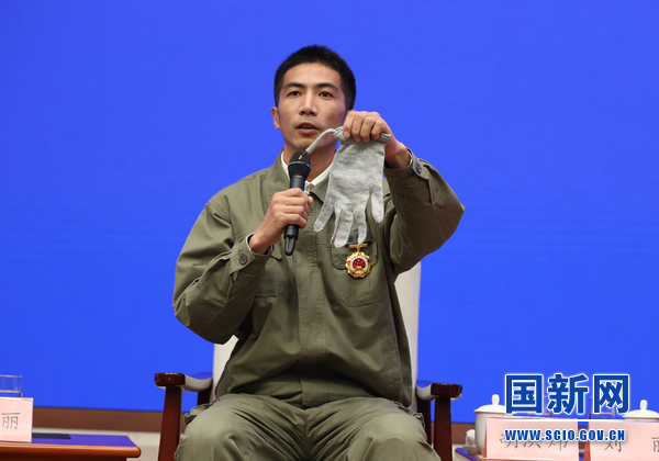 各位记者朋友们,大家好,我叫胡洪炜。2000年退伍以后成为我们国网湖北电力的一名一线工人,也正好赶上我们国家大力发展“电力高速公路”建设,就是通过超高压、特高压输电线路在全国长距离的进行电力资源调配,特高压带电作业一直是世界的禁区,但禁区也得有人去闯,2009年我非常有幸成为世界±800千伏特高压带电作业第一人。这是我们一直使用的手套,它是金属丝和金属粉末混编而成的,这里是个小辫子,它是连接衣服、裤子、袜子,帮它变成一个整体,就好象我们被一个金属笼子保护起来,然后从事带电作业。所以有人称我们是守护电网的特种兵,我就先介绍到这儿。谢谢。