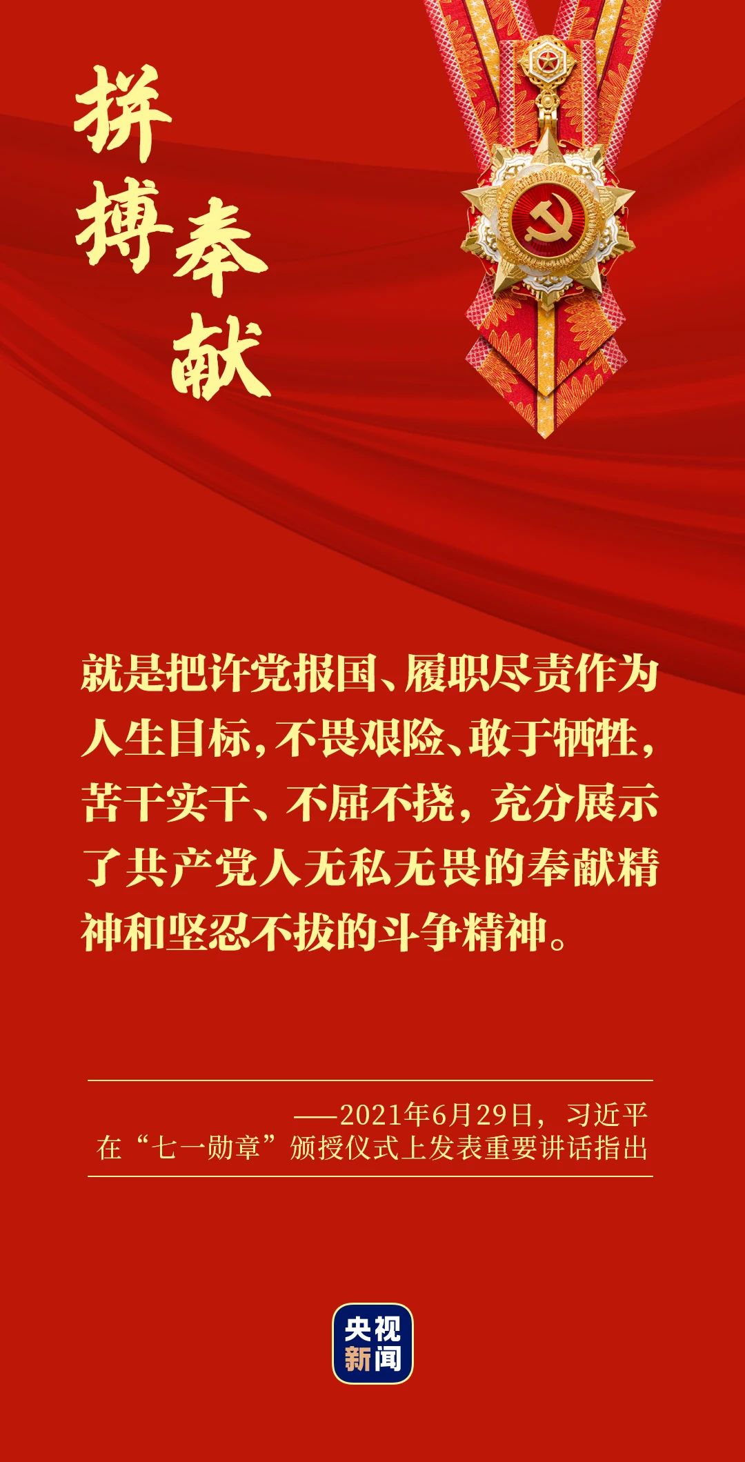 2021年6月29日,在庆祝中国共产党成立一百周年之际,党内最高荣誉——“七一勋章”颁授仪式在北京人民大会堂隆重举行。习近平总书记首次颁授“七一勋章”并发表重要讲话。