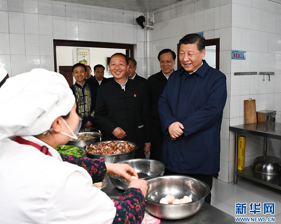 这是4月15日下午,习近平在石柱土家族自治县中益乡小学走进师生食堂,了解贫困学生餐费补贴和食品安全卫生情况。 新华社记者谢环驰摄