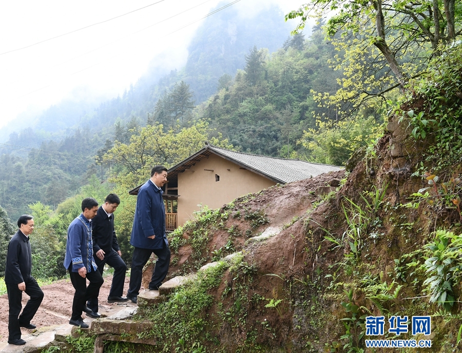 这是4月15日下午,在石柱土家族自治县中益乡华溪村,习近平踏着湿滑的石阶登上陡坡,前往贫困户谭登周家看望。 新华社记者谢环驰摄