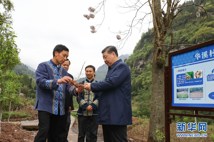 这是4月15日下午,习近平在石柱土家族自治县中益乡华溪村了解该村通过种植中药材黄精等特色经济作物带动村民脱贫的情况。 新华社记者鞠鹏摄