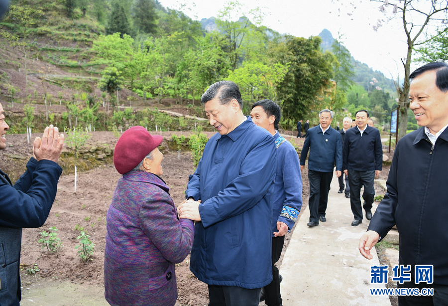 这是4月15日下午,习近平在石柱土家族自治县中益乡华溪村看望老党员、已脱贫户马培清一家。 新华社记者谢环驰摄