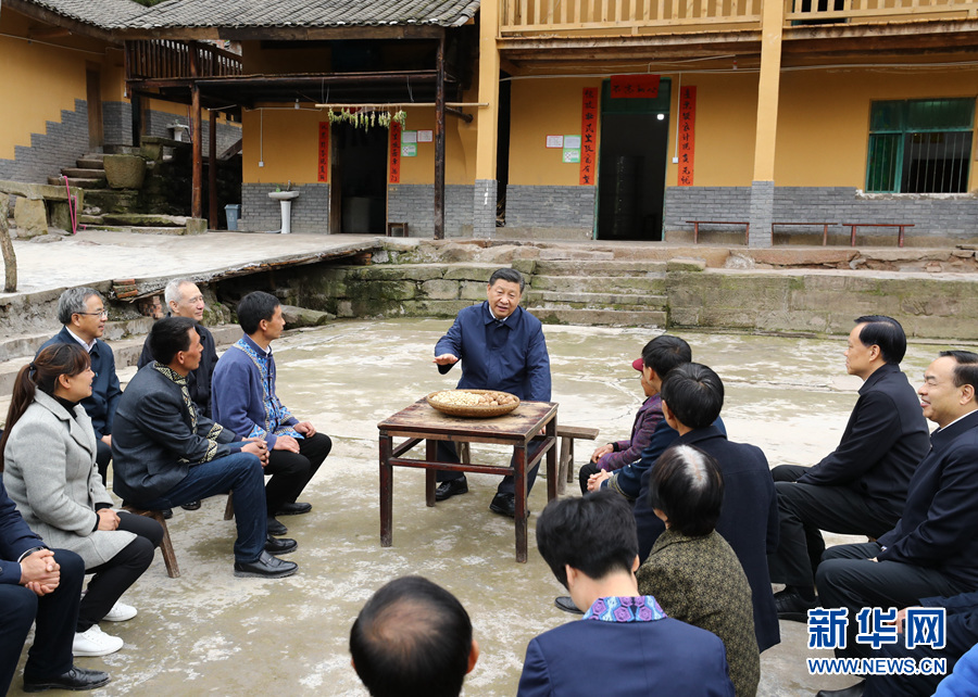 这是4月15日下午,习近平在石柱土家族自治县中益乡华溪村同村民代表、基层干部、扶贫干部、乡村医生等围坐在一起,共话脱贫攻坚。 新华社记者谢环驰摄