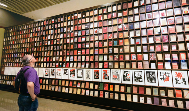 2018年5月9日,一位外国观众被北京“真理的力量——纪念马克思诞辰200周年主题展览”中一面展示不同国家出版的500多种《共产党宣言》的书墙所吸引。中新社记者 贾天勇/摄